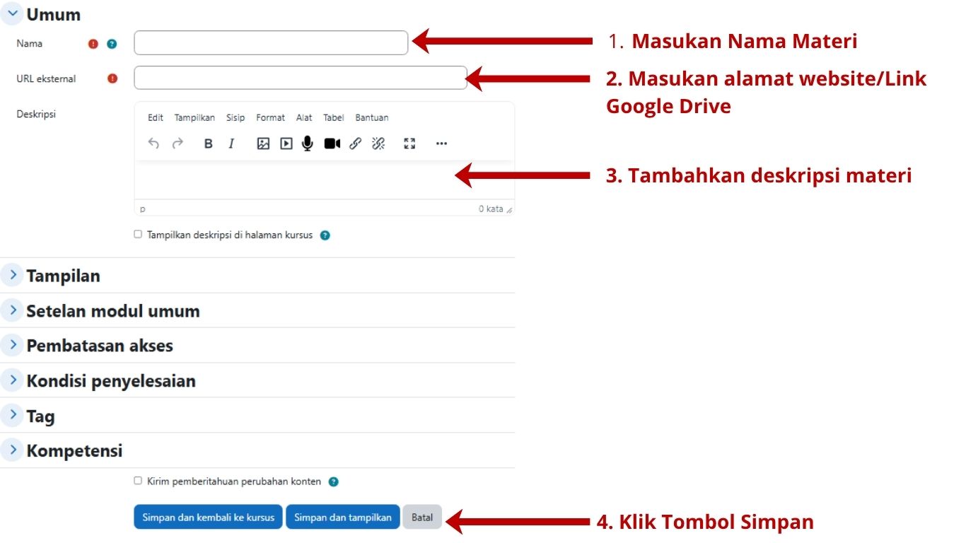 - Isi Nama Materi dan URL Eksternal (alamat website/file/Google Drive).