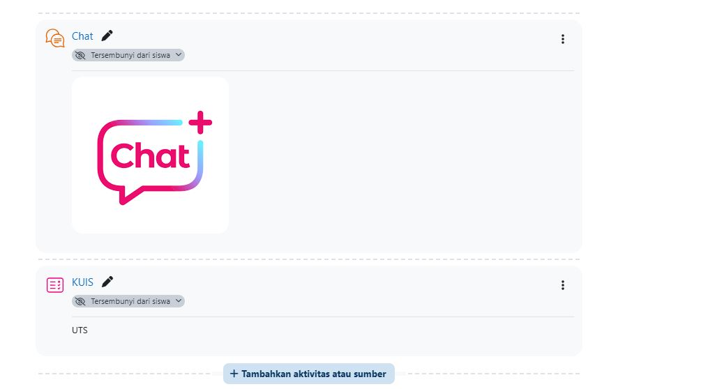 - Lakukan penambahan aktivitas (*chat*, *forum*) atau *resources* (dokumen).